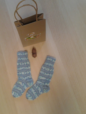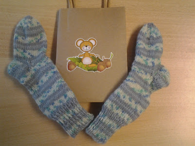 Hoje aproveitando o feriado, mostro-vos como prometi na última postagem as meias para um bébé. Quando soube que a minha conhecida estava grávida, claro que prometi umas meias para o menino que iría nascer em Junho. Este ano tem sido um ano de turbulência, faltou-me o tempo para as fazer antes do dia 11 Junho. Data em que o menino nasceu. Bom, o bébé nasceu em tempo quente as meias não estavam realmente a fazer falta. Agora a caminho do inverno e o frio a fazer-se sentir é mais que tempo de cumprir a promessa.